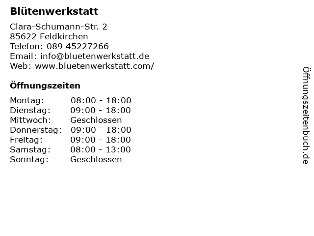 | Öffnungszeiten Blütenwerkstatt in Feldkirchen anzeigen | |