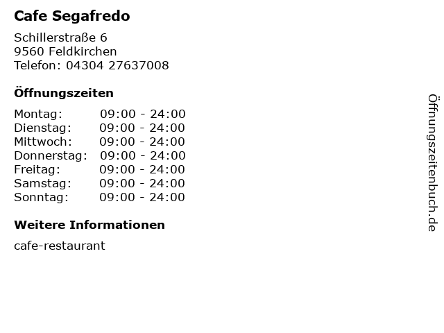 | Öffnungszeiten Cafe Segafredo in Feldkirchen anzeigen | |