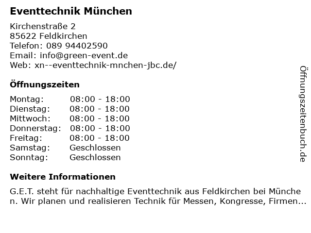 | Öffnungszeiten Eventtechnik München in Feldkirchen anzeigen | |