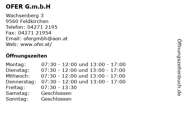 | Öffnungszeiten OFER G.m.b.H in Feldkirchen anzeigen | |