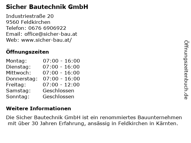 | Öffnungszeiten Sicher Bautechnik GmbH in Feldkirchen anzeigen | |