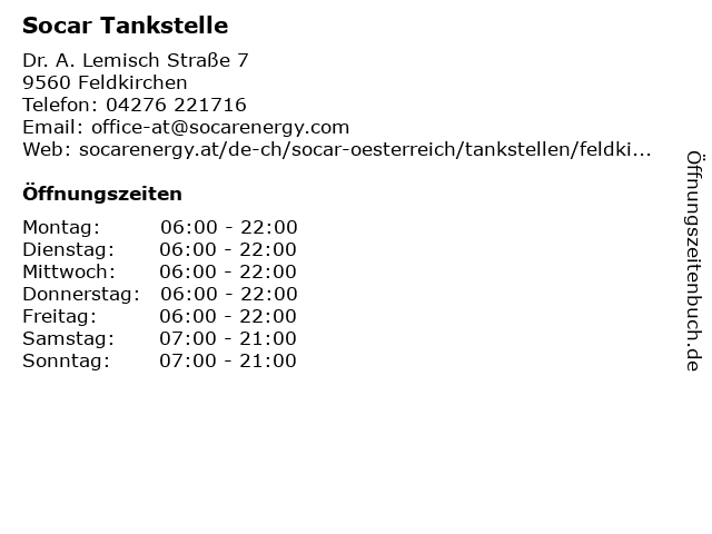| Öffnungszeiten Socar Tankstelle in Feldkirchen anzeigen | |