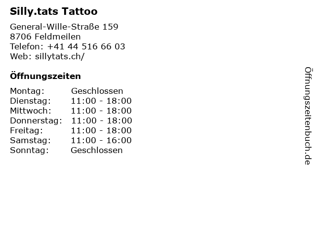 | Öffnungszeiten Silly.tats Tattoo in Feldmeilen anzeigen | |