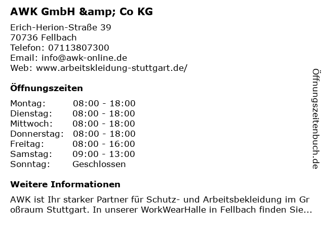| Öffnungszeiten AWK GmbH & Co KG in Fellbach anzeigen | |