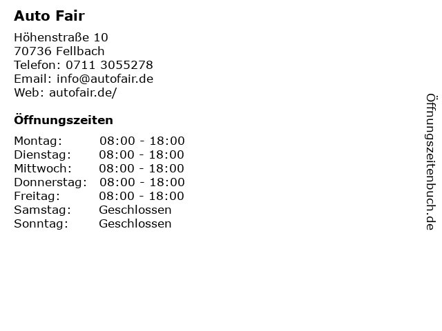 | Öffnungszeiten Auto Fair in Fellbach anzeigen | |