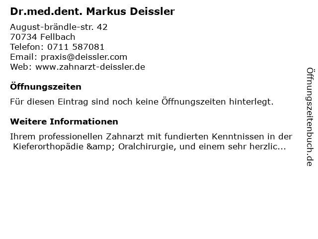 | Öffnungszeiten Dr.med.dent. Markus Deissler in Fellbach anzeigen | |