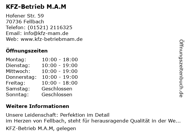 | Öffnungszeiten KFZ-Betrieb M.A.M in Fellbach anzeigen | |