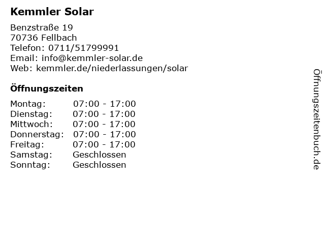 | Öffnungszeiten Kemmler Solar in Fellbach anzeigen | |