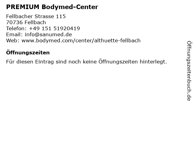 | Öffnungszeiten PREMIUM Bodymed-Center in Fellbach anzeigen | |