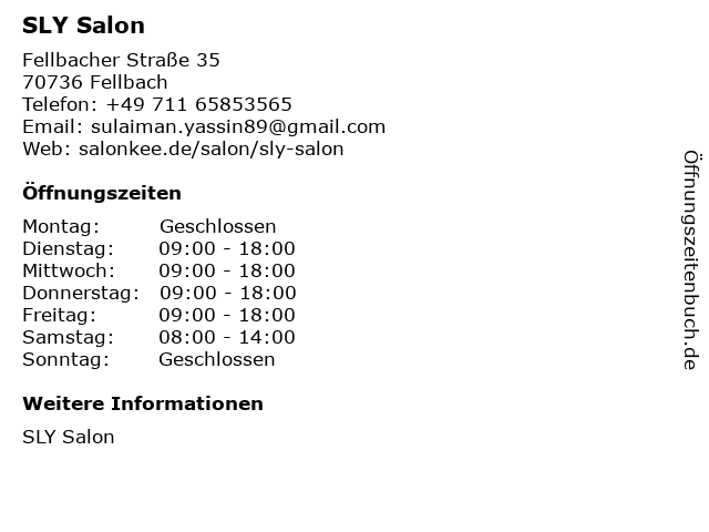 | Öffnungszeiten SLY Salon in Fellbach anzeigen | |