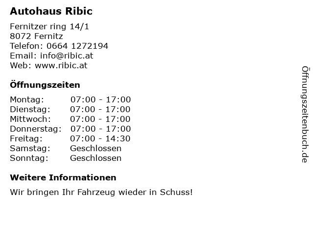 | Öffnungszeiten Autohaus Ribic in Fernitz anzeigen | |