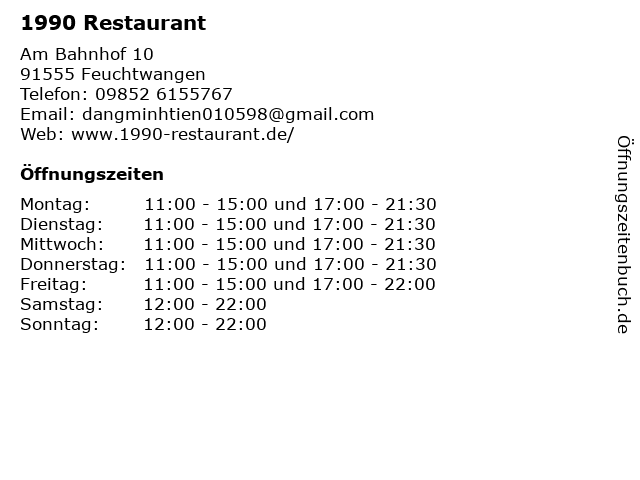 | Öffnungszeiten 1990 Restaurant in Feuchtwangen anzeigen | |