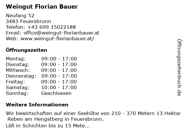 | Öffnungszeiten Weingut Florian Bauer in Feuersbrunn anzeigen | |