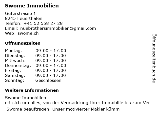| Öffnungszeiten Swome Immobilien in Feuerthalen anzeigen | |