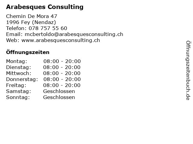 | Öffnungszeiten Arabesques Consulting in Fey (Nendaz) anzeigen | |