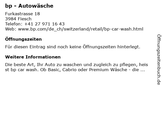 | Öffnungszeiten bp - Autowäsche in Fiesch anzeigen | |