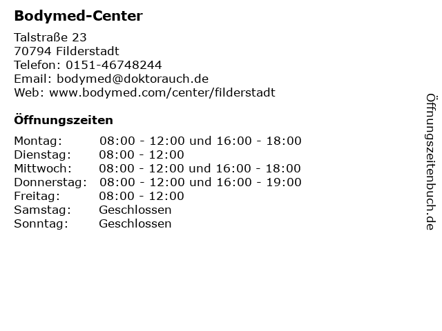 | Öffnungszeiten Bodymed-Center in Filderstadt anzeigen | |