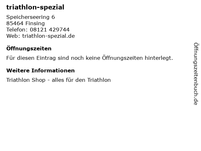 | Öffnungszeiten triathlon-spezial in Finsing anzeigen | |