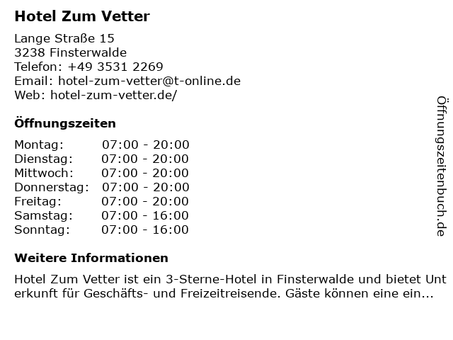 | Öffnungszeiten Hotel Zum Vetter in Finsterwalde anzeigen | |