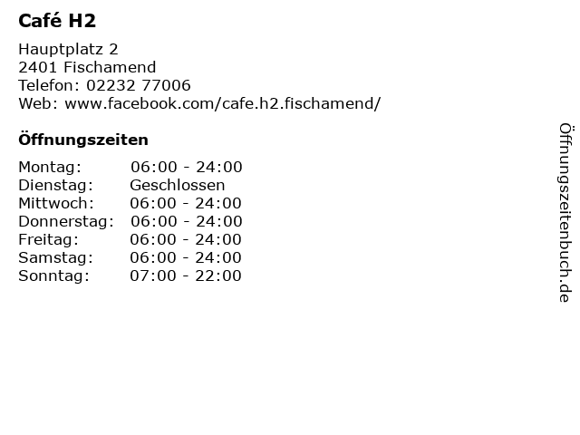 | Öffnungszeiten Café H2 in Fischamend anzeigen | |