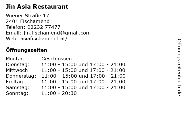 | Öffnungszeiten Jin Asia Restaurant in Fischamend anzeigen | |