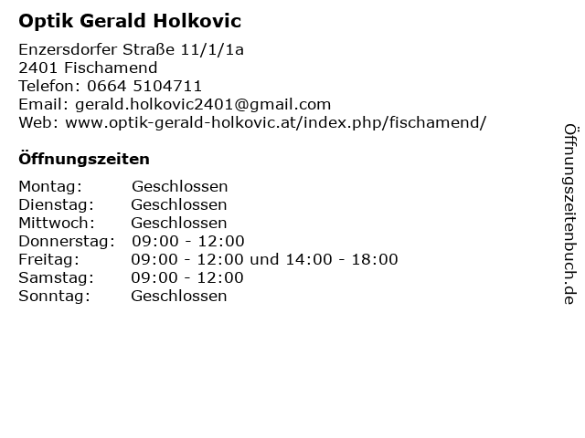 | Öffnungszeiten Optik Gerald Holkovic in Fischamend anzeigen | |