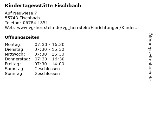 | Öffnungszeiten Kindertagesstätte Fischbach in Fischbach anzeigen | |