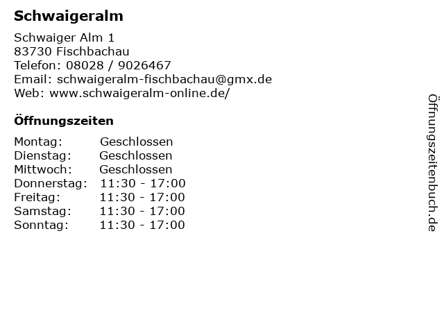 Öffnungszeiten Schwaigeralm in Fischbachau anzeigen | |