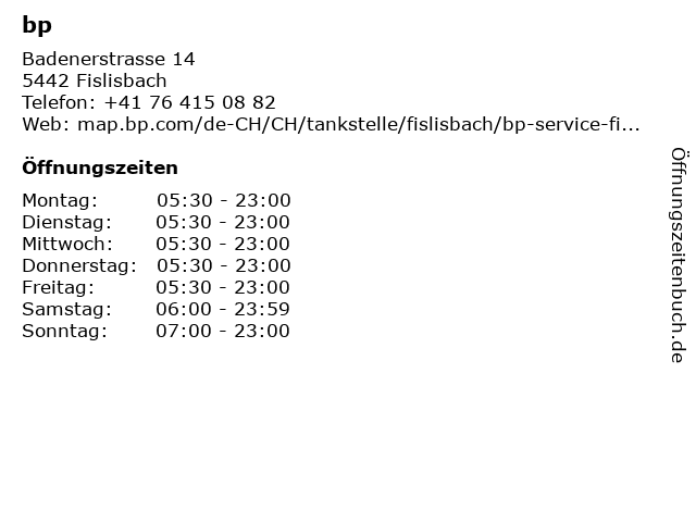 | Öffnungszeiten bp in Fislisbach anzeigen | |