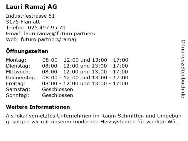 | Öffnungszeiten Lauri Ramaj AG in Flamatt anzeigen | |