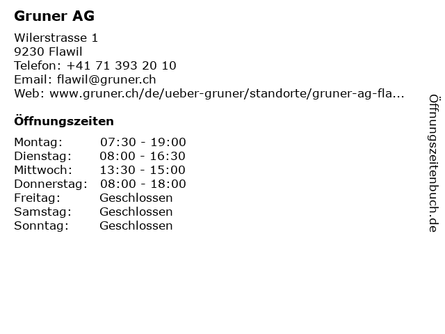 | Öffnungszeiten Gruner AG in Flawil anzeigen | |