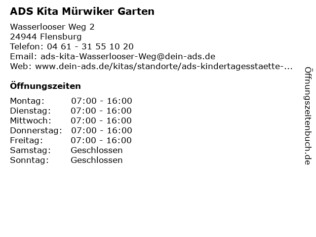 | Öffnungszeiten ADS Kita Mürwiker Garten in Flensburg anzeigen | |