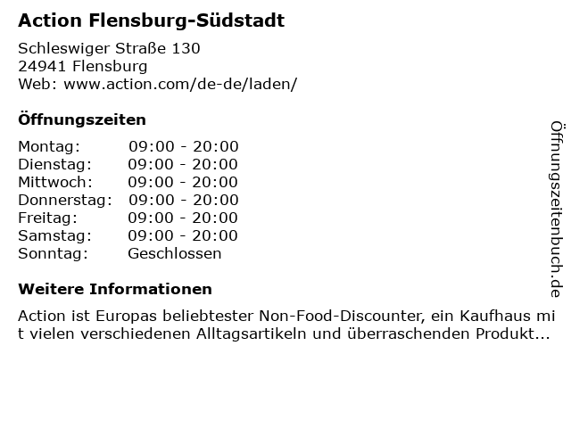 | Öffnungszeiten Action Flensburg-Südstadt in Flensburg anzeigen | |