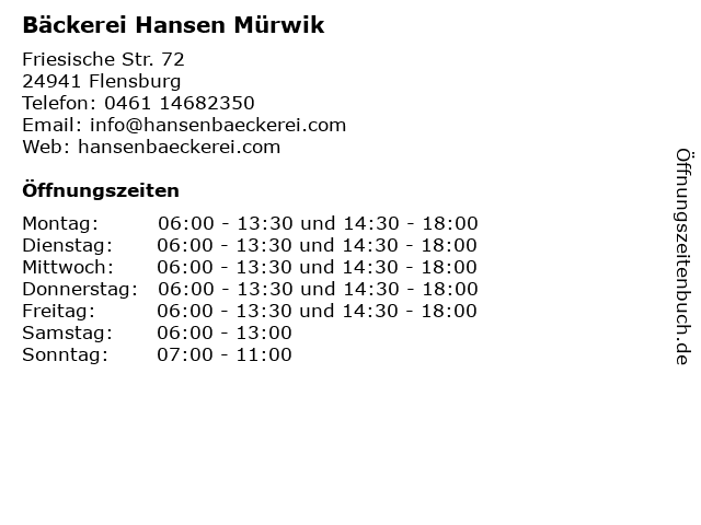 | Öffnungszeiten Bäckerei Hansen Mürwik in Flensburg anzeigen | |