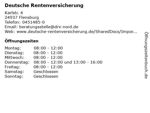 | Öffnungszeiten Deutsche Rentenversicherung in Flensburg anzeigen | |
