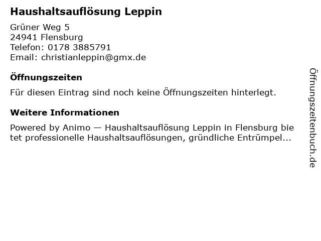 | Öffnungszeiten Haushaltsauflösung Leppin in Flensburg anzeigen | |