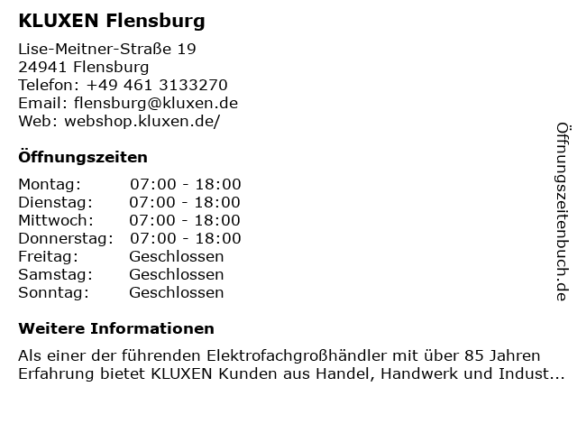 | Öffnungszeiten KLUXEN Flensburg in Flensburg anzeigen | |