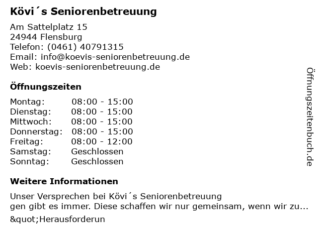 | Öffnungszeiten Kövi´s Seniorenbetreuung in Flensburg anzeigen | |