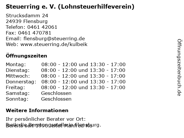 | 2 Lohnsteuerberatungsverbund e. V. -Lohnsteuerhilfeverein- Beratungsstelle Harrislee (Entfernung: 1,75 km) Geheimrat-Doktor-Schaedel-Straße 24, 24955 Harrislee 3 Lohnsteuerhilfeverein Flensburg e.V. Geschäftsstelle (Entfernung: 2,98 km) Eckernförder Landstr. 65, 24941 Flensburg 4 BVBB Lohnsteuerhilfeverein - Kathrin Klotzke-Rost (Entfernung: 3,06 km) Ochsenweg 30, 24941 Flensburg 5 Lohnsteuerberatungsverbund e.V. - Lohnsteuerhilfeverein - Beratungsstellenleiter Ingo Marten (Entfernung: 5,10 km) Wasserloos 2, 24943 Flensburg 6 Lohnsteuerberatungsverbund e.V. - Lohnsteuerhilfeverein - Beratungsstellenleiter Hans-Jürgen Bahnsen (Entfernung: 13,87 km) Irisbogen 1, 24963 Tarp |