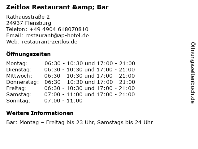 | Öffnungszeiten Zeitlos Restaurant & Bar in Flensburg anzeigen | |