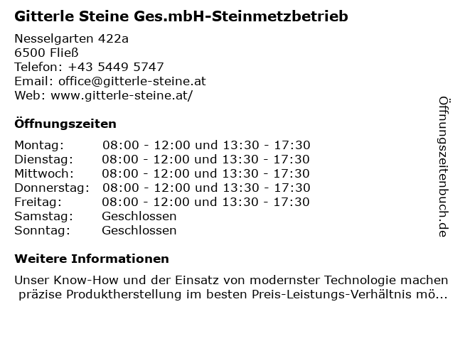 Branchen & Suchbegriffe zu Gitterle Steine Ges.mbH-Steinmetzbetrieb:bodenplatten fließ, duschtassen fließ, esstische fließ, ges.mbh, gitterle, küchenplatten fließ, schrifttafeln fließ, steine, steinmetzbetrieb, steinmetzer fließ, steinpflege fließ, stufenplatten fließ, waschtische fließ, ziersteine fließ |