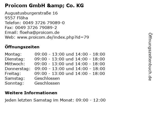 | Öffnungszeiten Proicom GmbH & Co. KG in Flöha anzeigen | |