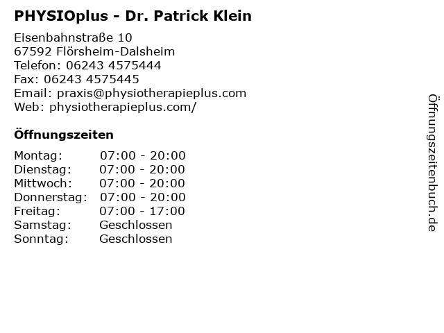 1 PHYSIOplus | Prof. Dr. Patrick Klein (Entfernung: 0,33 km) Wonnegaustraße 7, 67592 Flörsheim-Dalsheim 2 Berthold Klein Uwe Schaalo Klein & Schaalo (Entfernung: 0,92 km) Gartenstr. 3, 67592 Flörsheim-Dalsheim 6 Dieter Dech & Patrick Nücken Steuerberatung (Entfernung: 15,58 km) Hans-Böckler-Straße 7, 67304 Eisenberg (Pfalz) |