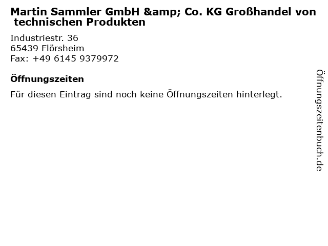 | Öffnungszeiten Martin Sammler GmbH & Co. KG Großhandel von technischen Produkten in Flörsheim anzeigen | |