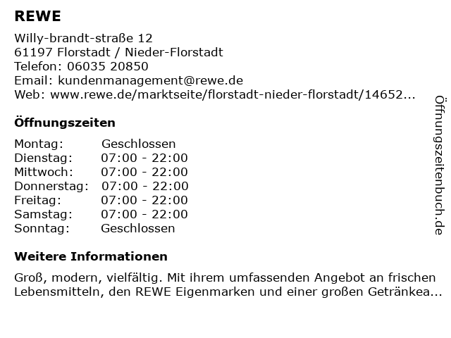 | Öffnungszeiten REWE in Florstadt / Nieder-Florstadt anzeigen | |