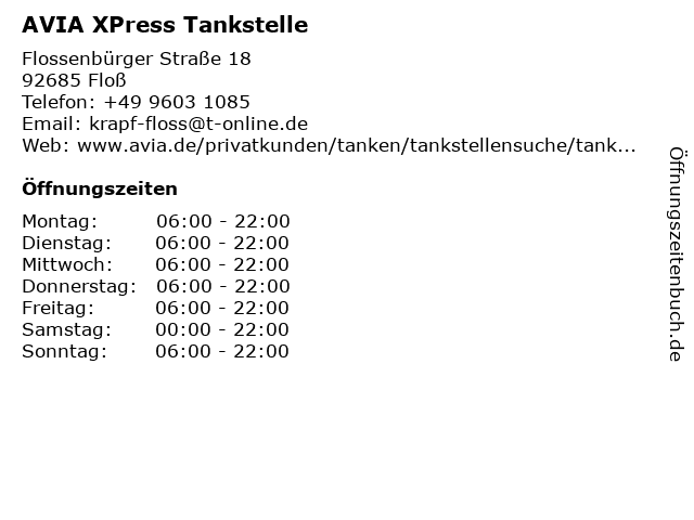 | Öffnungszeiten AVIA XPress Tankstelle in Floß anzeigen | |