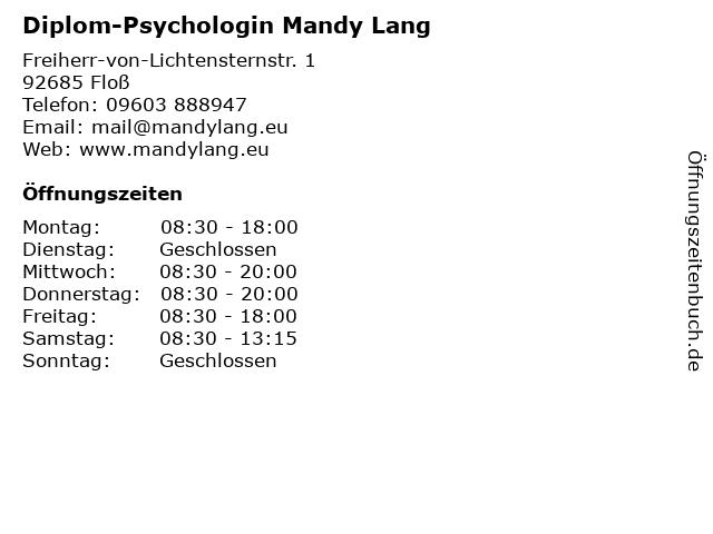 | Öffnungszeiten Diplom-Psychologin Mandy Lang in Floß anzeigen | |