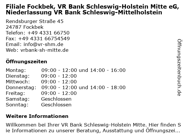 Branchen & Suchbegriffe zu Filiale Fockbek, VR Bank Schleswig-Holstein Mitte eG, Niederlassung VR Bank Schleswig-Mittelholstein:bank, eg, fockbek, holstein, mitte, mittelholstein, niederlassung, vr |