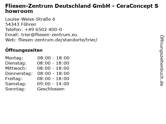 1 Fliesen-Zentrum Deutschland GmbH - Großhandel (Entfernung: 0,00 km) Louise-Weiss-Straße 6, 54343 Föhren 2 Fliesen-Zentrum Deutschland GmbH - Materialausgabe (Entfernung: 0,00 km) Louise-Weiss-Straße 6, 54343 Föhren 6 |