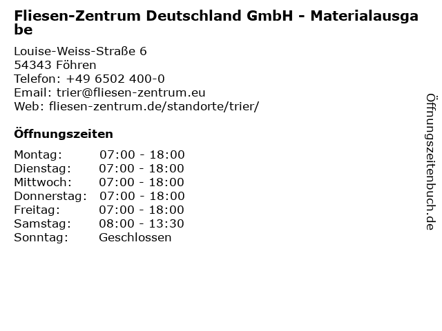 1 Fliesen-Zentrum Deutschland GmbH - CeraConcept Showroom (Entfernung: 0,00 km) Louise-Weiss-Straße 6, 54343 Föhren 2 Fliesen-Zentrum Deutschland GmbH - Großhandel (Entfernung: 0,00 km) Louise-Weiss-Straße 6, 54343 Föhren 6 |